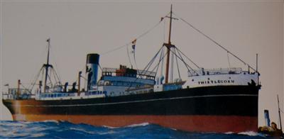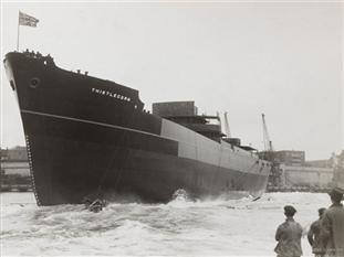 började med Thistle följt av ett ord på det skotska språket gaeliska. Gorm betyder t.ex. blå och roy i Thistleroy betydde röd. Rederiets logga var Skottlands nationalblomma tisteln som alltid fanns på skorstenarna. ![]() Det enda existerande fotografiet på Thistlegorm visar sjösättningen vid Sunderland den 9 april 1940.